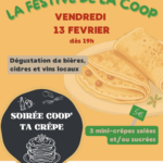 LA FESTIVE Coop' ta Crêpe, vous accueillera vendredi 13 Février, à partir de 19h, sans réservation.