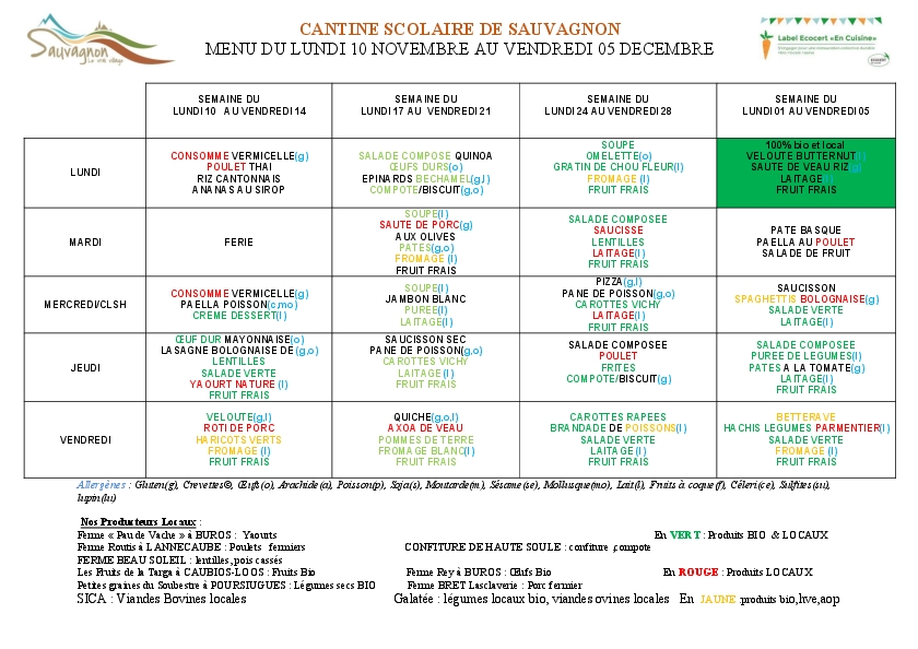 Restauration scolaire Ecole et Jeunesse Scolarité Restauration scolaire Transports scolaires Centre de loisirs Menu du 10 novembre au 5 décembre 2025 : Participez au défi Locavore
