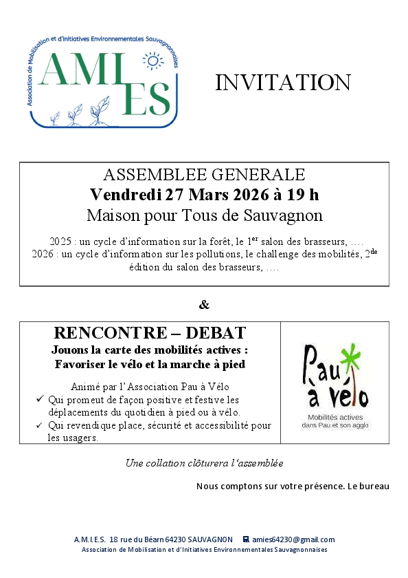L’ASSEMBLÉE GÉNÉRALE aura lieu le vendredi 27 mars à 19h, à la Maison Pour Tous de Sauvagnon.